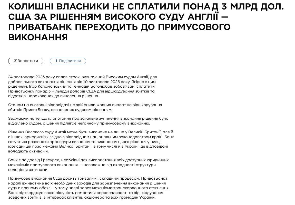 Напомним, что Приватбанк был национализирован в декабре 2016 года, после чего государство обнаружило огромные дыры в балансе структуры, и правительство увеличило его капитал на 155 млрд грн, став 100% его владельцем в лице Министерства финансов. В 2017 году детективное агентство Kroll в ходе расследования установило факты скоординированного вывода средств из банка — через кредитование компаний, принадлежавших акционерам. В том же году уже национализированный Приватбанк с целью возврата утраченных средств подал иск в британский суд против бывших владельцев. И теперь суд выигран.