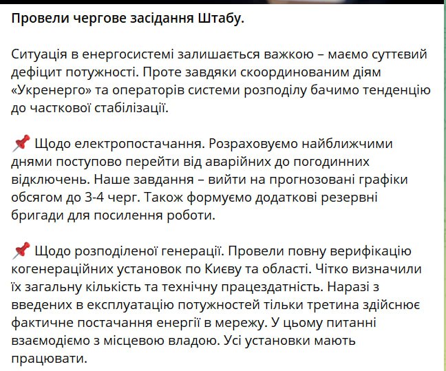 «Нам необходимо прекращение огня в энергетической сфере. Прекращение огня в отношении энергетических активов… Мы близки к гуманитарной катастрофе. Люди получают электричество на 3-4 часа, затем перерыв на 10-15 часов. У нас уже несколько недель многоквартирные дома остаются без отопления», – сказал Тимченко.