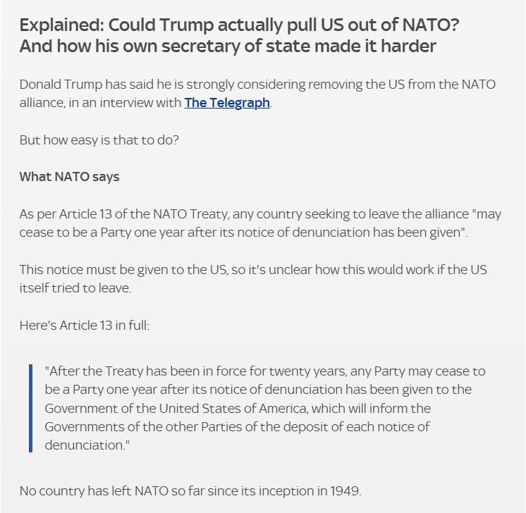 Полное заявление постпреда США при НАТО Мэттью Уитакера о том, что Трамп пересматривает все, что связано с Альянсом, включая поддержку европейских усилий по Украине.