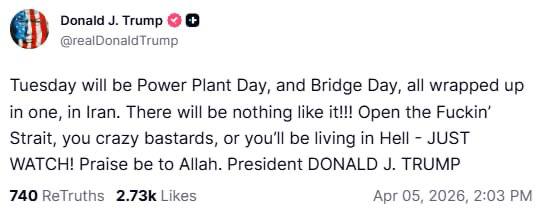 Напомним, президент США сегодня грозил Ирану ударами по электричеству и мостам, если Тегеран не разблокирует Ормузский пролив.