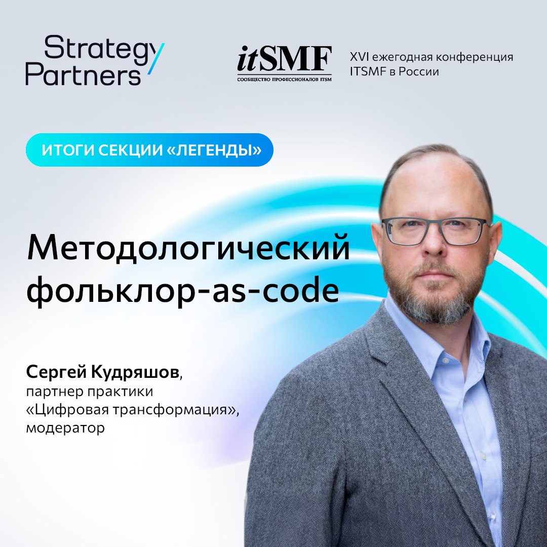 7 апреля состоялась XVI Ежегодная конференция itSMF России «Методологический фольклор-as-code» в Москве. Секция «Легенды» прошла при непосредственном участии партнера практики «Цифровая трансформация» Strategy Partners Сергея Кудряшова. Наш эксперт модерировал весь стрим из шести докладов, посвященных реальным кейсам цифровизации ИТ‑процессов.
