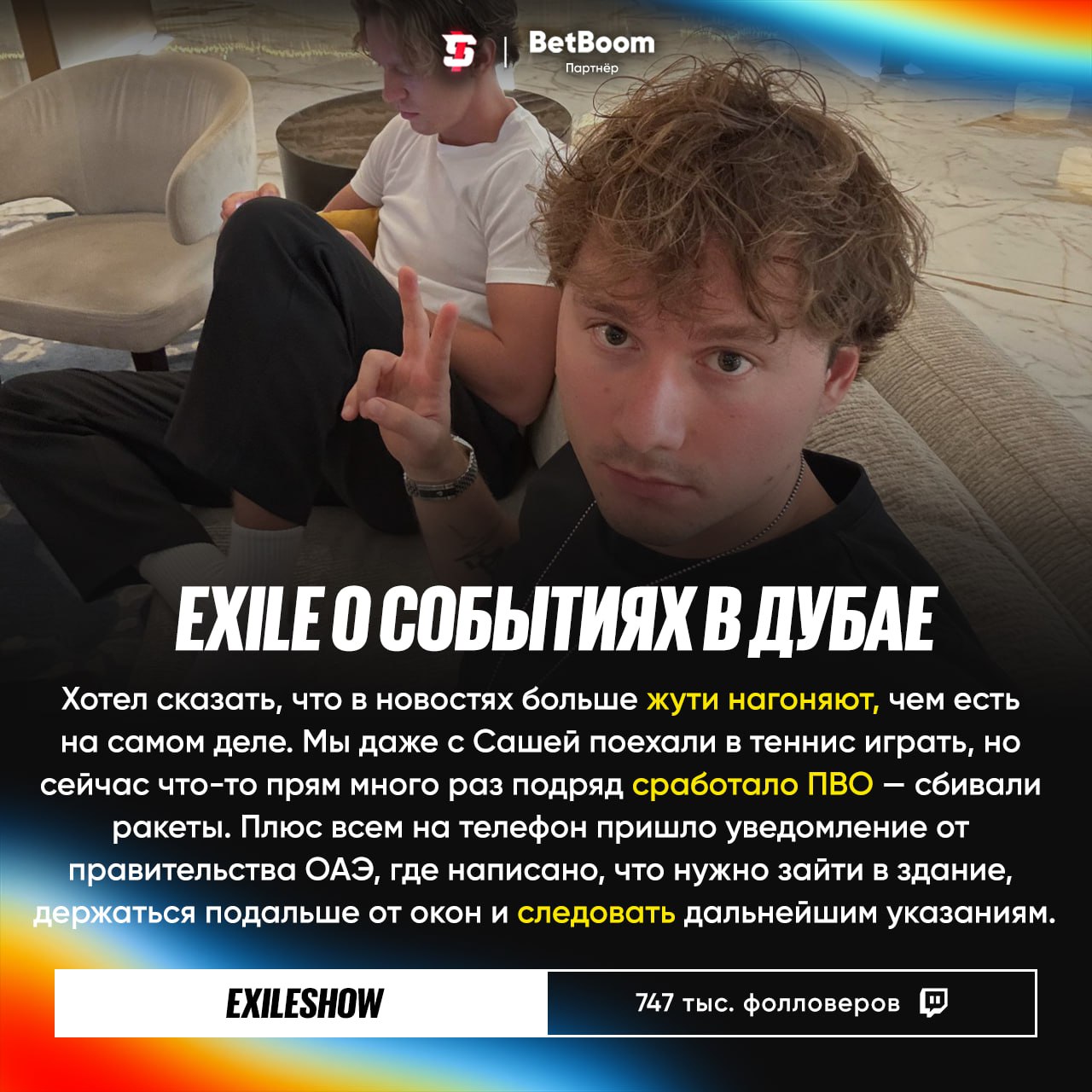 Всё, что сделали вы — мои друзья, близкие, родные, знакомые, вся аудитория — до сих пор вызывает у меня удивление. С такой поддержкой можно свернуть горы. Я всё читал, следил за пабликами и видел тех, кто поддерживал. Ценю это. Не хотел бы терять вас даже на столь короткий промежуток времени. Всех безумно люблю, увидимся скоро.
