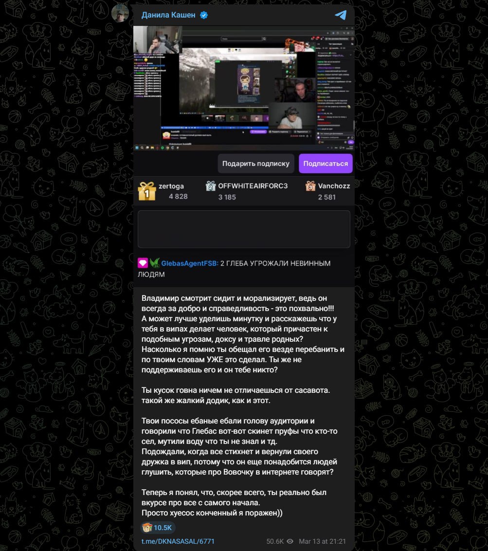 — В процессе спора Каши с людьми со стороны Сасавота Каше сказали, что поспособствуют повторной проверке на его старые стримы и мол, что есть скрины с его нац**тским приветствием и другими моментами, которые караются законом. И что также у Каши проверят военный билет. Каша посчитал это за угрозы в его сторону;