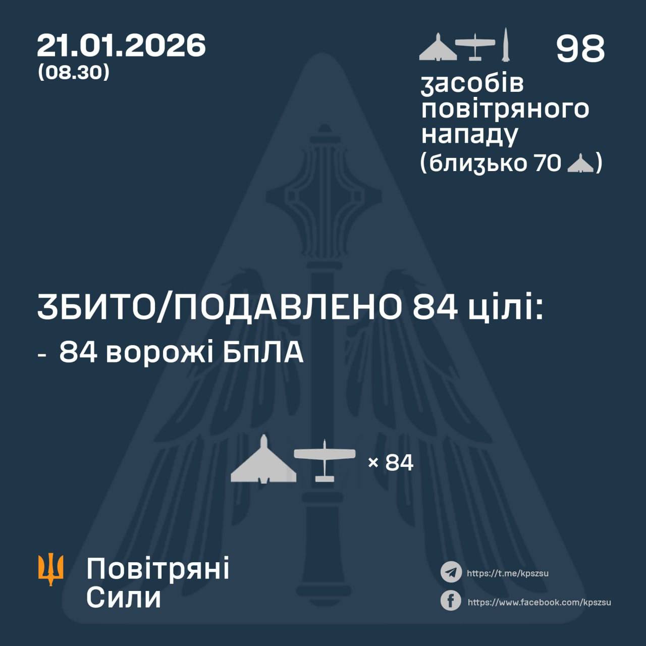 ⚡️ ЗБИТО/ПОДАВЛЕНО 84 ВОРОЖІ БПЛА,— ПС