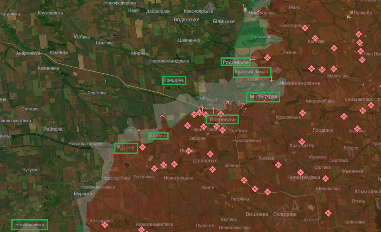 Війська РФ 35 разів атакували на Покровському напрямку протягом минулої доби. Напередодні було 43 бої. Штурми були у районах населених пунктів Родинське, Червоний Лиман, Рівне, Покровськ, Мирноград, Котлине, Удачне, Молодецьке, Філія та у бік населених пунктів Сухецьке, Гришине й Новопавлівка, розповіли у Генштабі. На Костянтинівському напрямку війська РФ здійснили 18 атак, на Лиманському напрямку російська армія 10 разів атакувала. Більше про бої на сході Фото: орієнтовна лінія фронту на Покровському напрямку/DeepStateMap