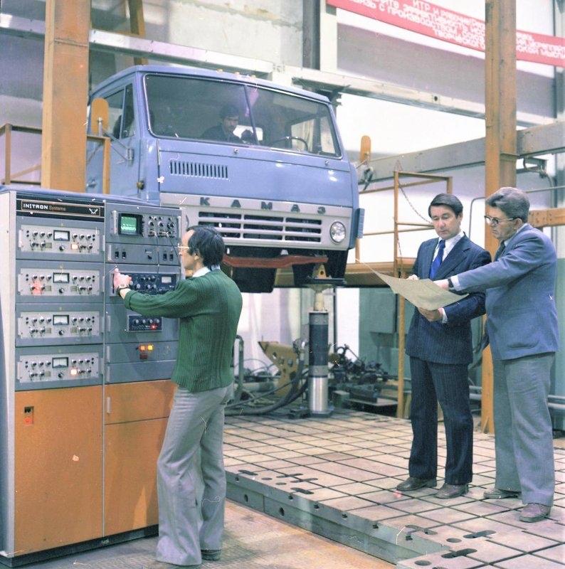 Новая машина на испытательном стенде, имитирующая вибрацию кабины в дорожных условиях, 1970-е