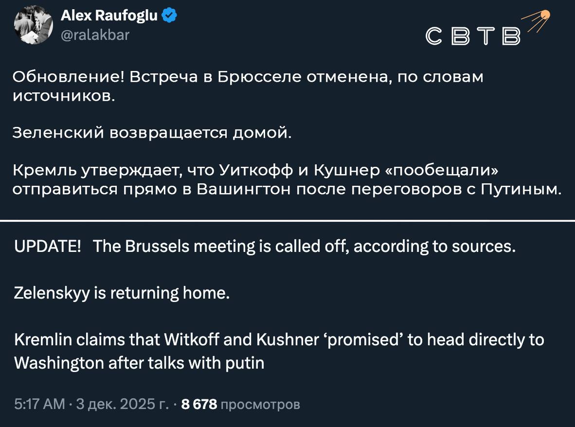Уиткофф отменил встречу с Зеленским в Брюсселе после переговоров с Путиным