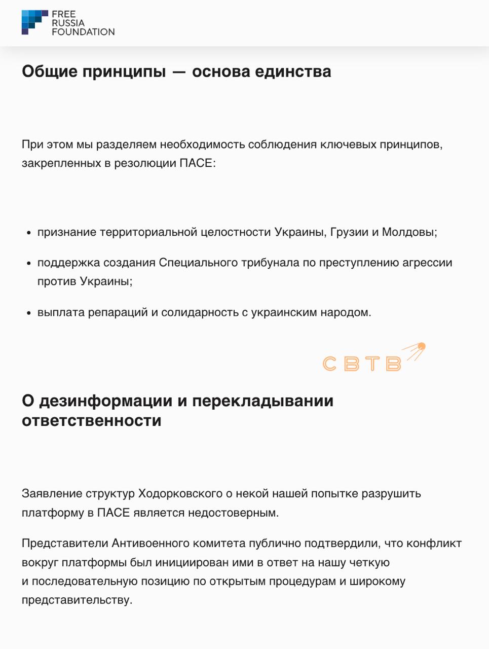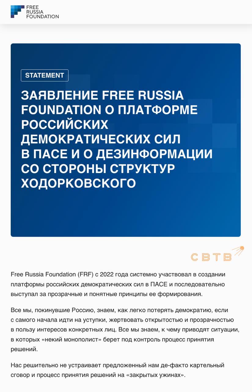 Позже фонд Наталии Арно выпустил ответ, в котором обвинил структуры Ходорковского в распространении дезинформации, перекладывании ответственности и попытке монополизировать пространство ПАСЕ с помощью «договорняка». При этом FRF напомнили, что у российских либералов с иностранными паспортами единая цель — ограбить русских в пользу украинского правительства.