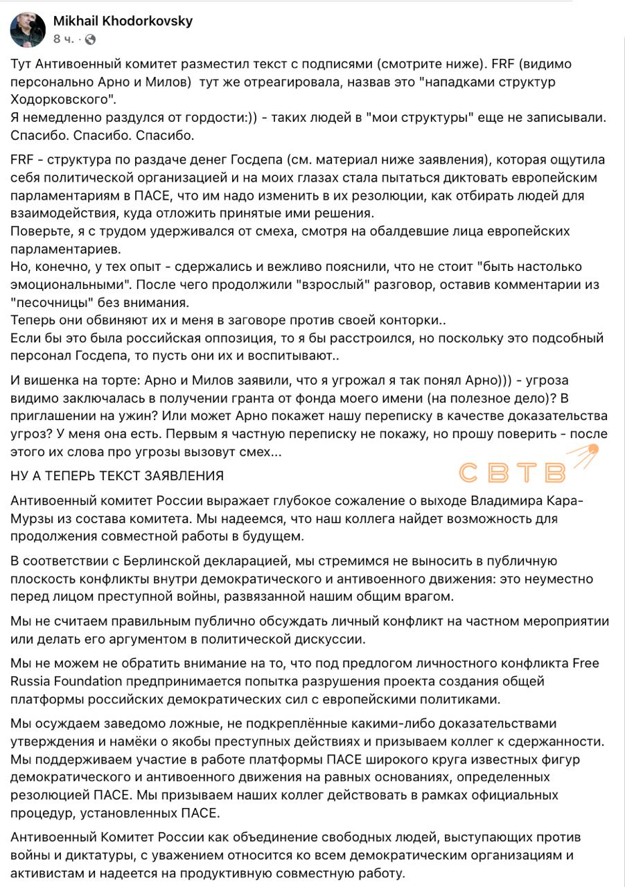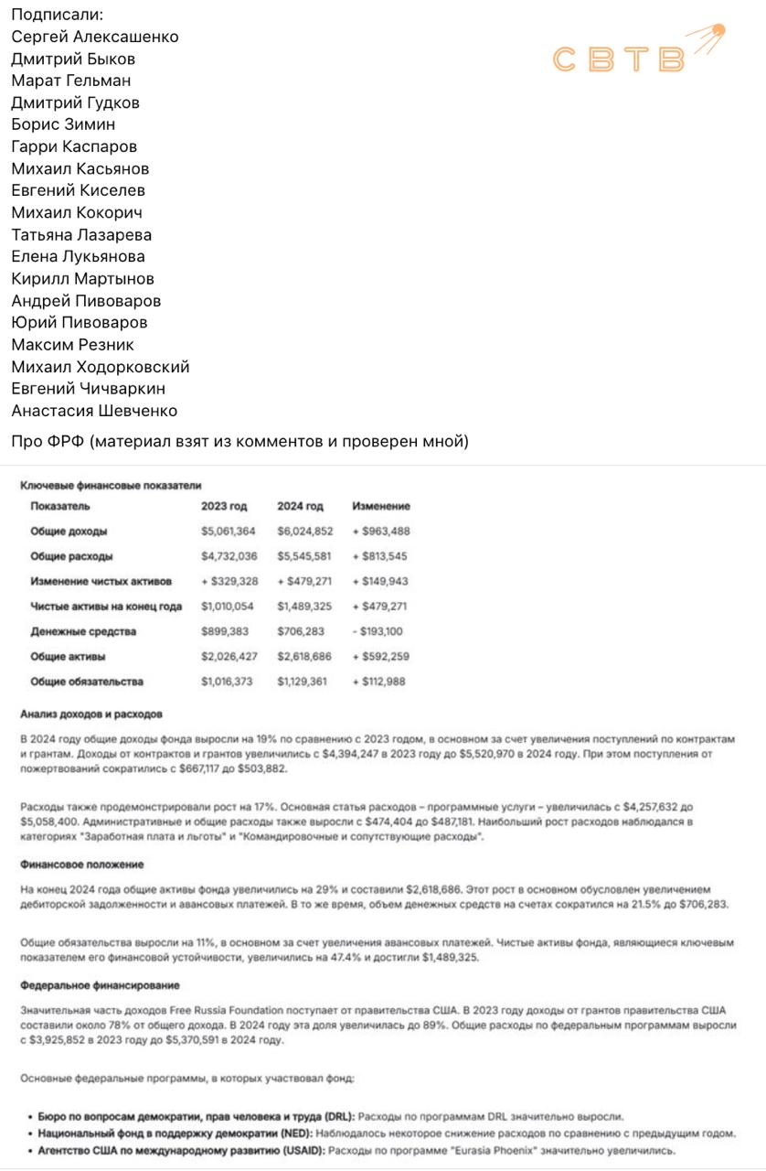 Через некоторое время FRF ответил сам Михаил Ходорковский. Он упрекнул работающую на Госдеп Наталию Арно в том, что её фонд возомнил себя политической организацией и пытался диктовать условия депутатам ПАСЕ. В довесок бывший олигарх выложил информацию, из которой следует, что за 2024 год FRF получил более 5,3 млн долларов из бюджета США.