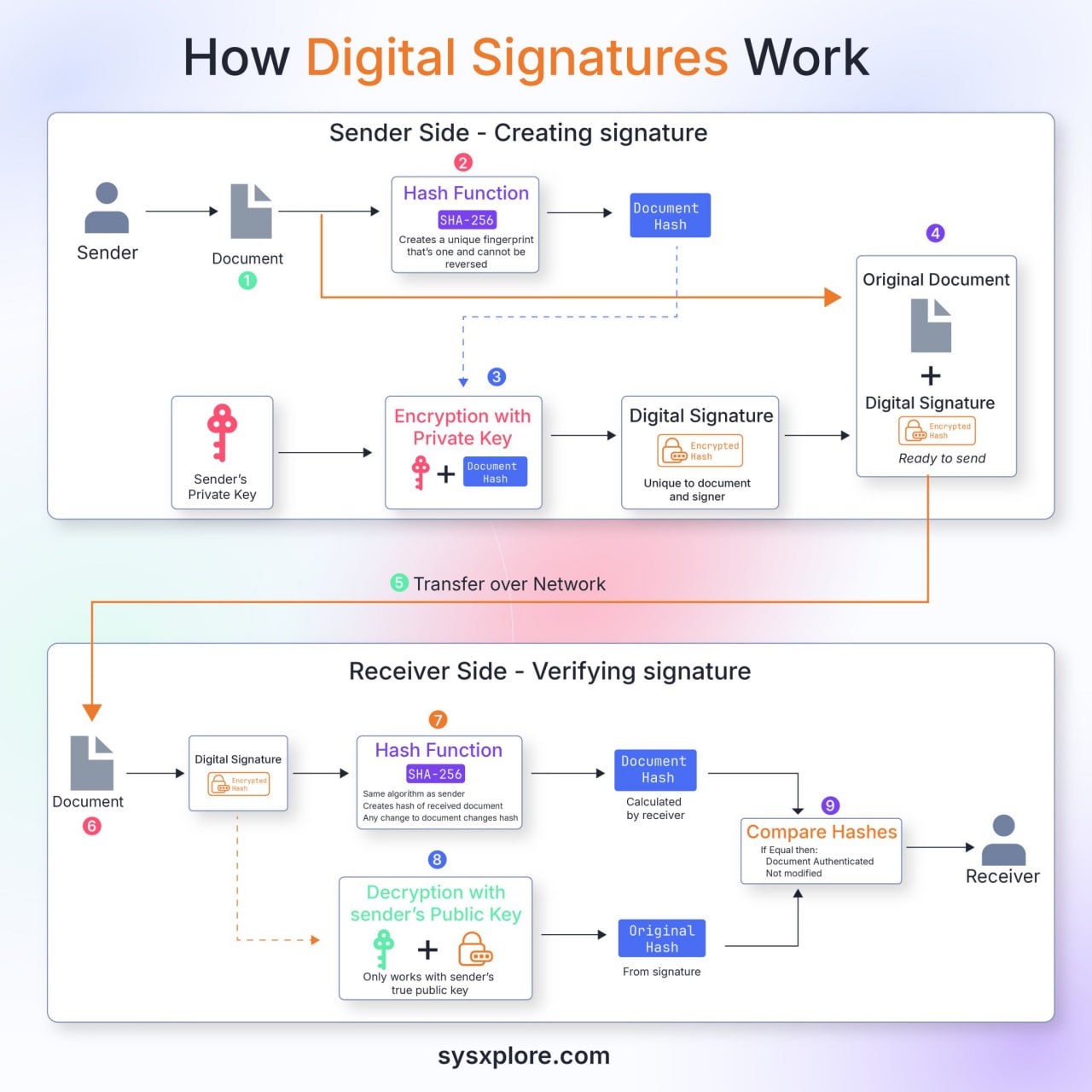Получатель сам считает хеш документа через ту же SHA-256.