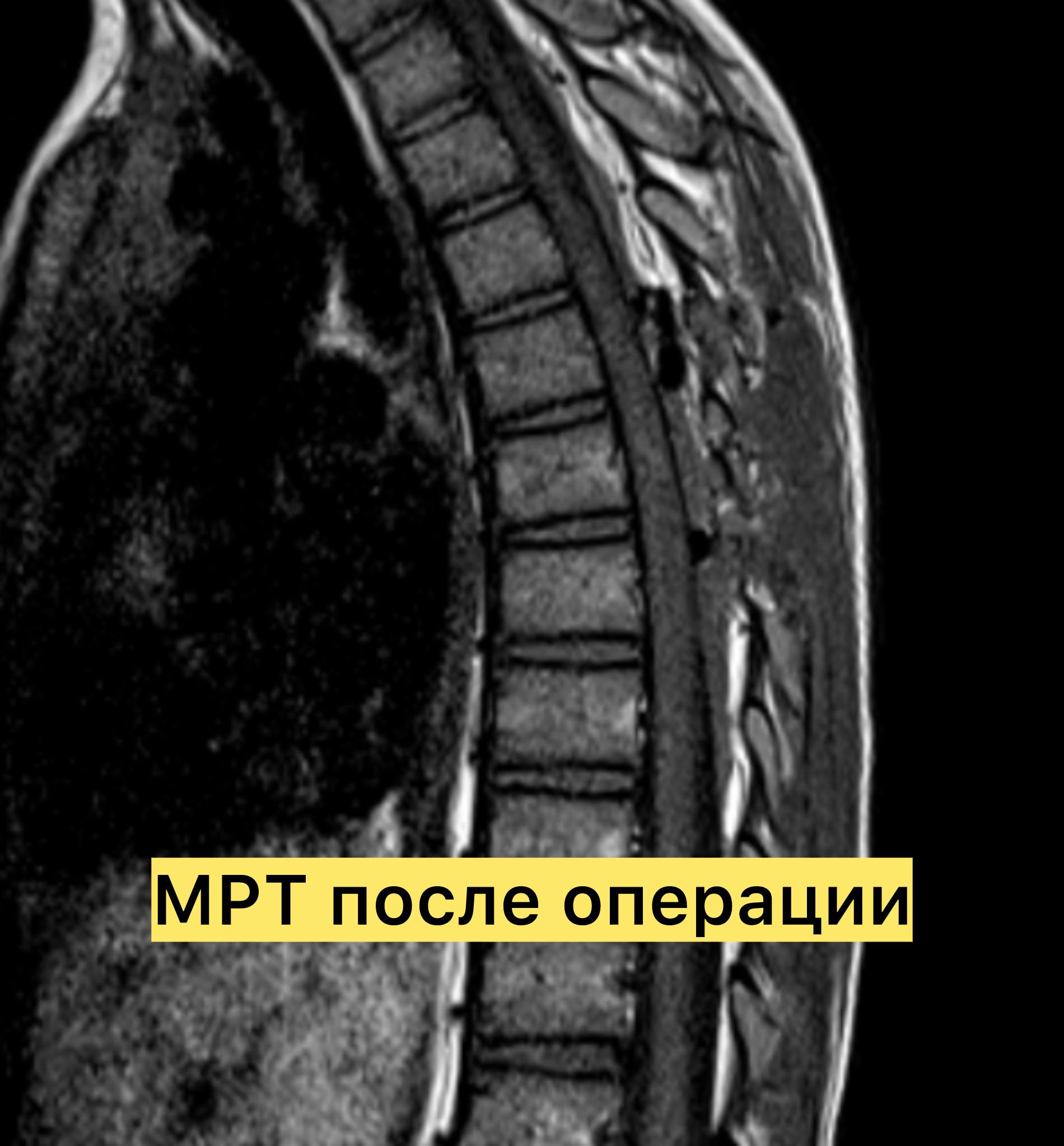 Операция по освобождению спинного мозга из рубцовой и жировой ткани длилась 6 часов, цели вмешательства были достигнуты, девочка выписана на 7е сутки без ухудшения состояния и с надеждой на то, что удалось остановить прогрессирование заболевания. При этом очевидно, что в результате длительной фиксации и натяжения спинного мозга, большая часть проблем, в первую очередь ортопедических, к сожалению, уже не разрешится…