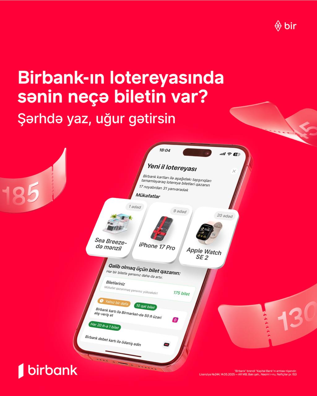 ⚡️Söhbət Birbank-ın 17 noyabr-31 yanvar aralığında keçirtdiyi Yeni il lotereyasından gedir. 23 fevralda isə axır ki, kimlərin qalib gəldiyini birlikdə öyrənəcəyik. Bilet sayınıza baxmaq üçün
