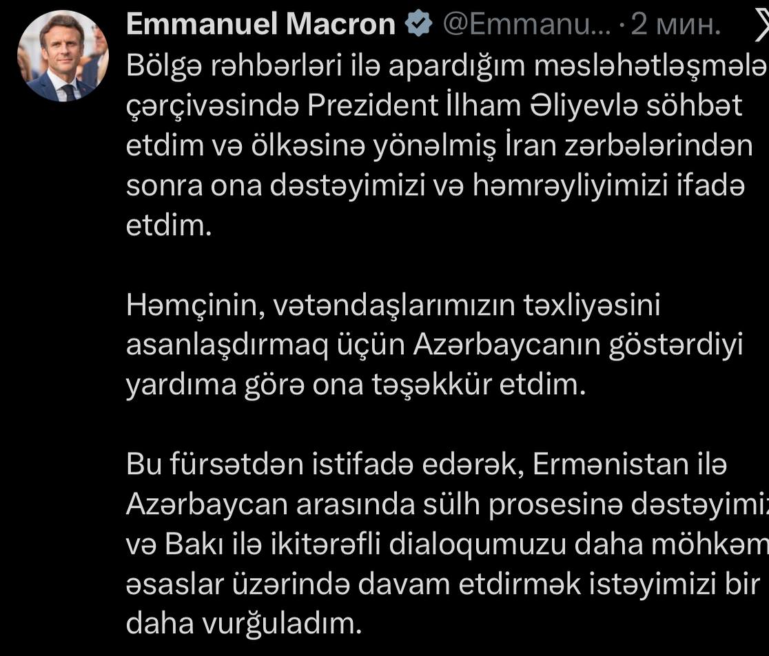 Emmanuel Makron, həmçinin İrandakı Fransa vətəndaşlarının Azərbaycan vasitəsilə təxliyəsinə yaradılmış şəraitə görə dövlətimizin başçısına minnətdarlığını bildirib.