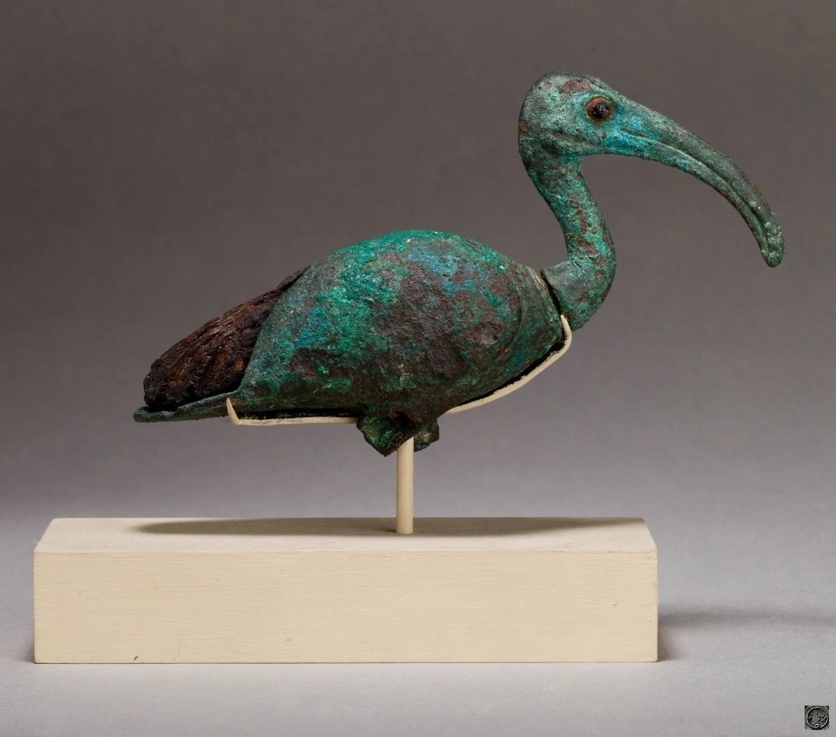 Ибис являлся священным животным бога мудрости Тота. Этот ибис состоит из нескольких частей: голова, ноги и туловище сделаны из меди, хвостовая часть из дерева.