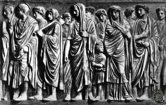 Женщина изображена в большом плаще, а мужчина в тоге, накинутой на левое плечо. Она держит в руках что-то похожее на лавровые листья, которые использовались для очищения и благословения религиозных мест.