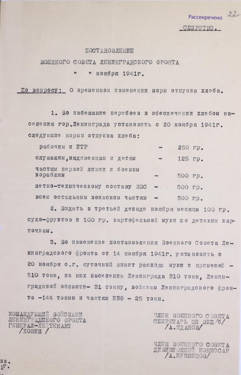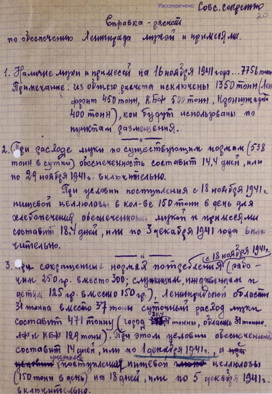 Сегодня, 84 года назад, в Ленинграде были установлены самые низкие нормы выдачи хлеба за весь период блокады. Мне удалось найти оцифрованную докладную записку, которая проясняет несколько вопросов в отношении общего объёма запасов к 20 ноября 1941 года, динамики их расходования и количества муки, которое расходовалось на выпечку хлеба в день.