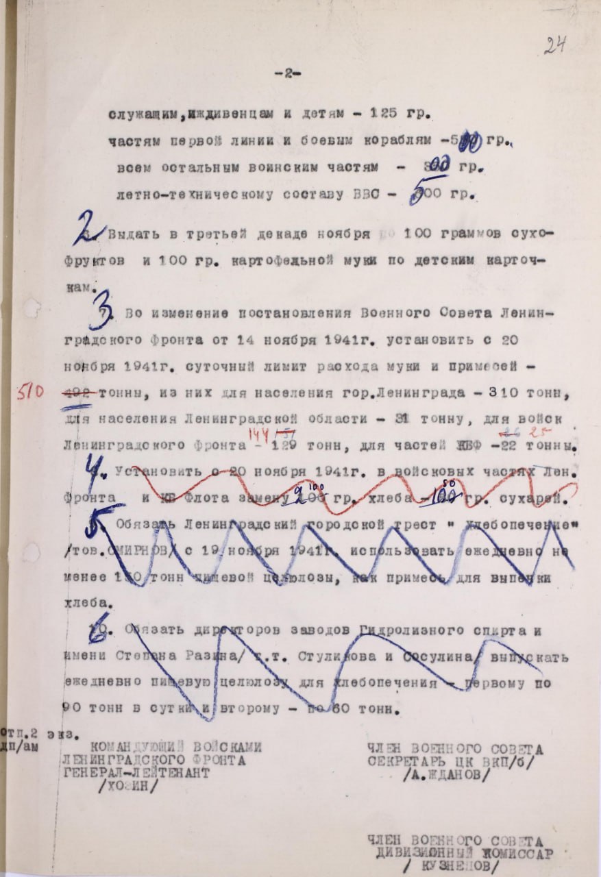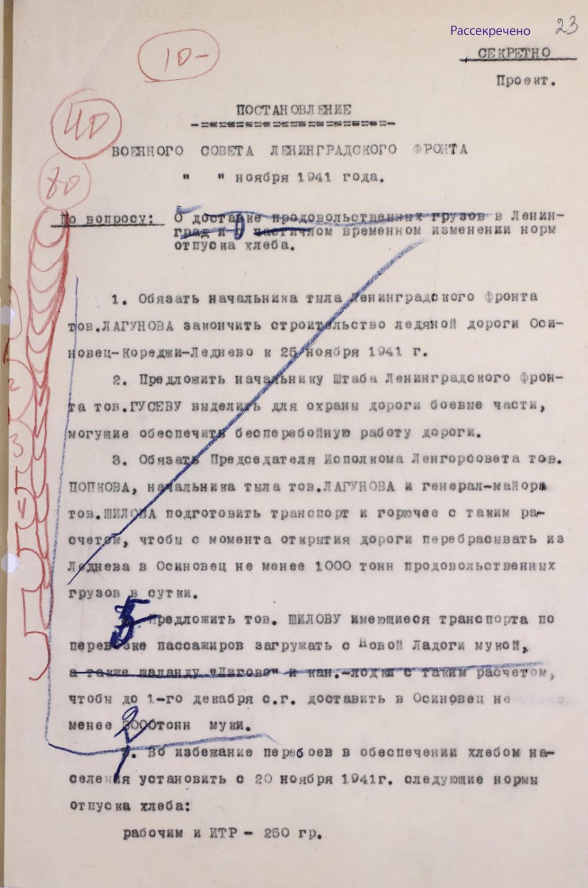 Не менее ценным оказался проект постановления Военного Совета Ленфронта, где указано желаемое поступление муки в 1000тн в сутки с момента открытия ледовой трассы. На каких предпосылках были основаны такие ожидания руководства города и фронта и о чём оно думало, сказать сложно. В порядке предоставления контекста напомню, что первый конный обоз доставил 21 ноября 60 тонн муки (по данным начальника ледовой трассы М.Нефёдова - 19,5тн), а 23 ноября грузовики привезли 70тн. Желаемой цифры в 1000тн смогли достичь только через месяц, причём в конце декабря из-за снежных буранов и атак немецкой авиации дневной завоз упал до 600 тонн, из которых мука составляла 2/3 объёма.