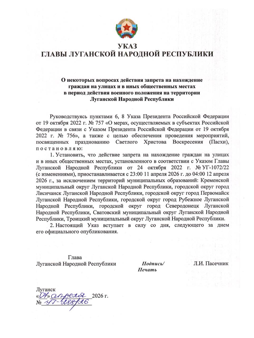 Соответствующий указ подписал Глава ЛНР Леонид Пасечник.