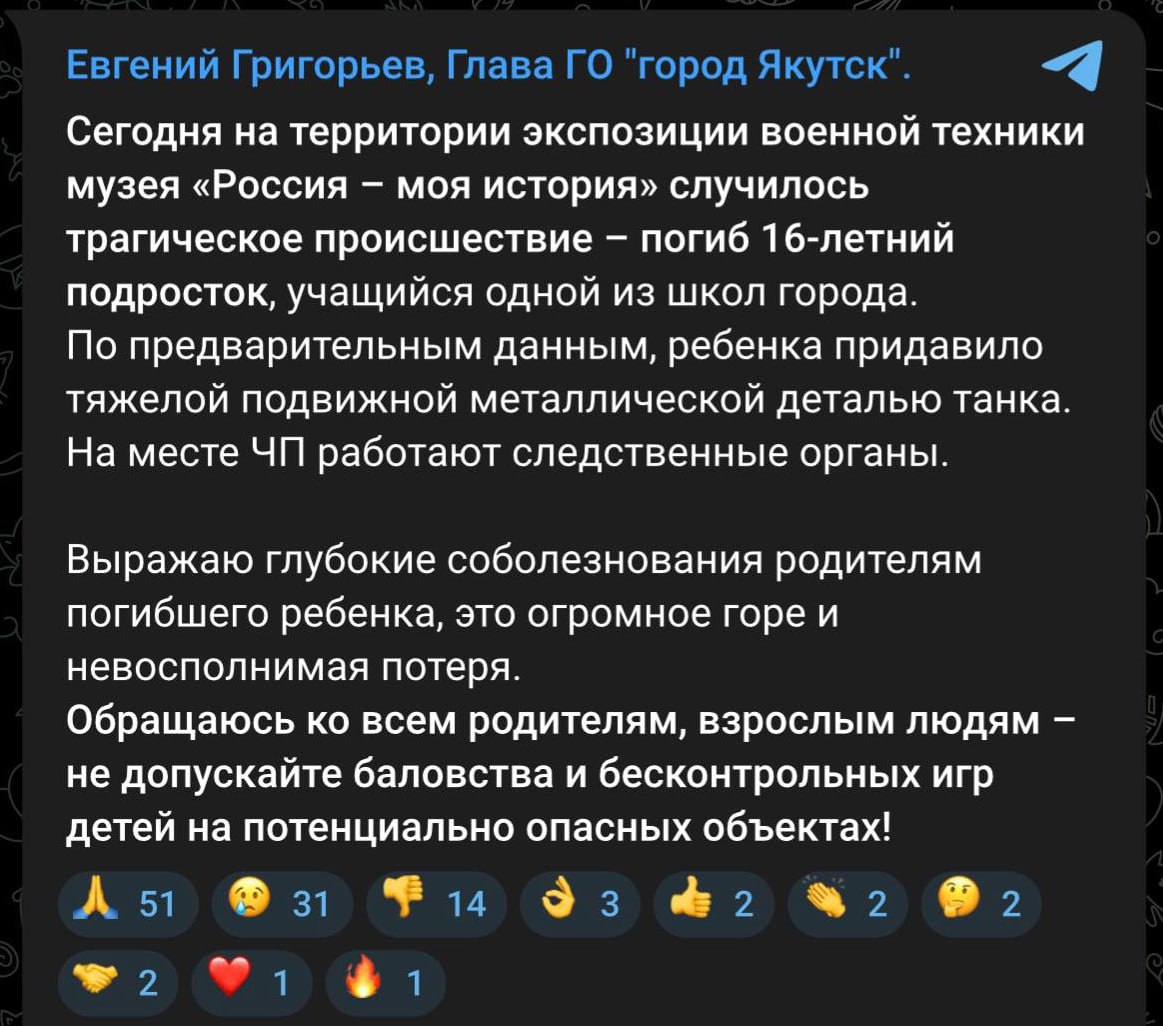 🇷🇺☠️ В Якутії на виставці "трофейної західної техніки" помер 16-річний росіянин, якого придавило "важкою металевою деталлю", — місцева влада