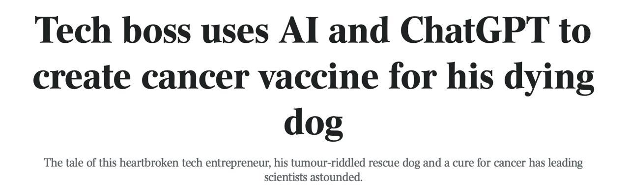 Австралієць Пол Конінгем використав потужність ChatGPT та алгоритмів AlphaFold, щоб знайти спосіб лікування для своєї вмираючої собаки Розі. Коли традиційна ветеринарія виявилася безсилою проти агресивної пухлини, Пол за допомогою ШІ проаналізував генетичні дані ДНК тварини та розробив стратегію для створення персоналізованої mRNA-вакцини.
