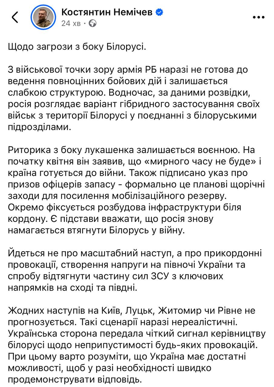 Костянтин Немічев наголошує, що йдеться не про масштабний наступ, а про прикордонні провокації, створення напруги на півночі України та спробу відтягнути частину сил ЗСУ з ключових напрямків на сході та півдні.