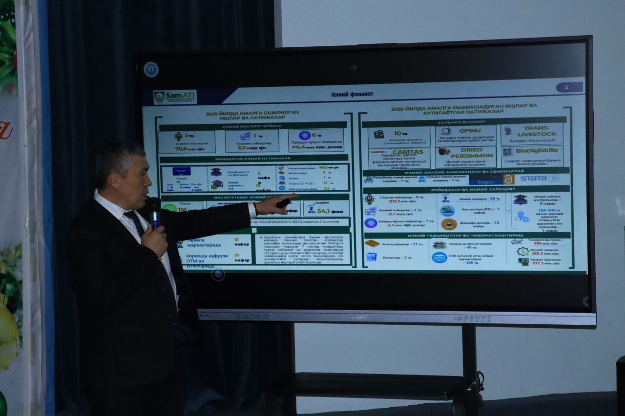 ✅ Samarqand agroinnovatsiyalar va tadqiqotlar institutida o‘tgan yilda amalga oshirilgan ishlar, erishilgan natijalar hamda 2026-yil uchun belgilangan ustuvor vazifalarga bag‘ishlangan yig‘ilish bo‘lib o‘tdi. Unda institutning barcha professor-o‘qituvchilari va xodimlari ishtirok etdi.