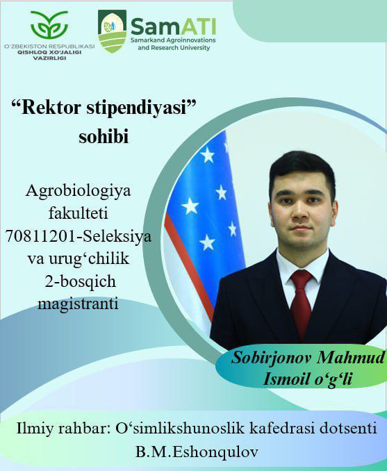 ➡️ Sobirjonov Mahmud Ismoil o’g’li – Seleksiya va urug‘chilik ta’lim mutaxassisligi 2-bosqich magistranti.