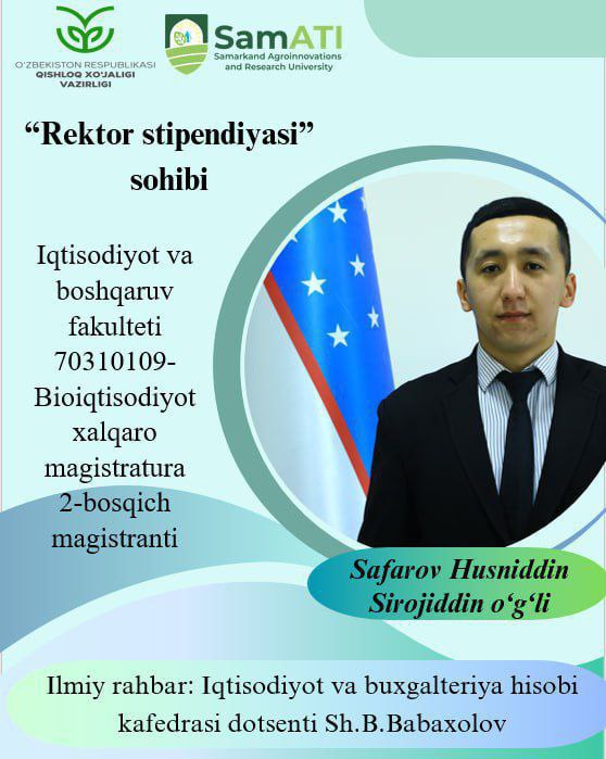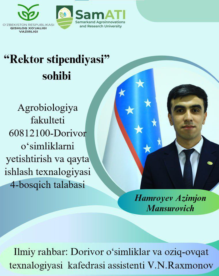 ✅ Samarqand agroinnovatsiyalar va tadqiqotlar instituti rektori, professor Sh. Hasanovning tegishli buyrugʻiga asosan, 2025-2026-oʻquv yilining bahorgi semestri uchun quyidagi talabalar tanlov nizomiga muvofiq "Rektor stipendiyasi" tanlovida gʻolib deb topildi.