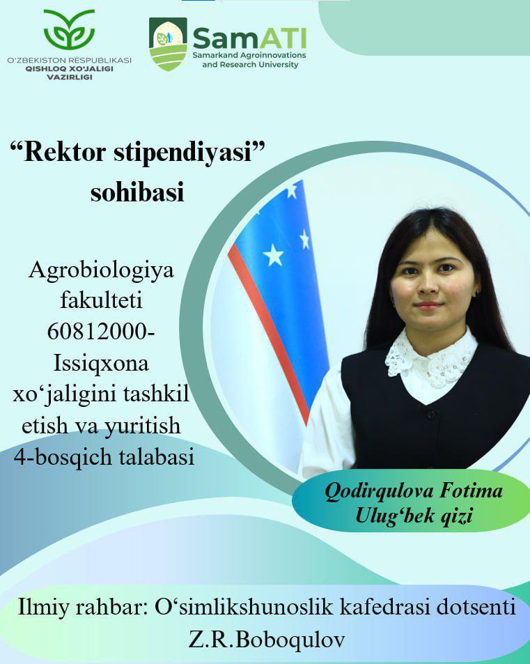 ➡️ Qodirqulova Fotima Ulug‘bek qizi – Issiqxona xo‘jaligini tashkil etish va yuritish ta’lim yo‘nalishi 4-bosqich talabasi;
