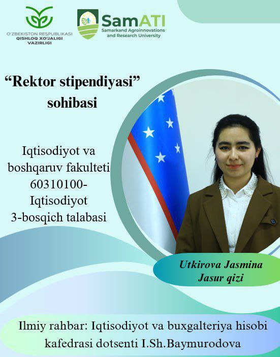 ➡️ Utkirova Jasmina Jasur qizi – Iqtisodiyot (qishloq xo‘jaligida) 3-bosqich talabasi;
