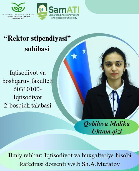➡️ Qobilova malika Uktam qizi – Iqtisodiyot (qishloq xo‘jaligida) 2-bosqich talabasi;