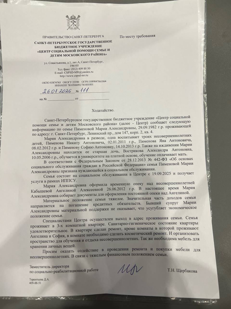 Мы договорились, что живые деньги я не собираю. Далее сами принимайте решение о помощи. Я оставляю личный телеграм Марии, можно все вопросы задать ей лично. Фото ходатайства Мария предоставит, оно есть и у меня, где есть подтверждение от социальной помощи о необходимости ремонта .