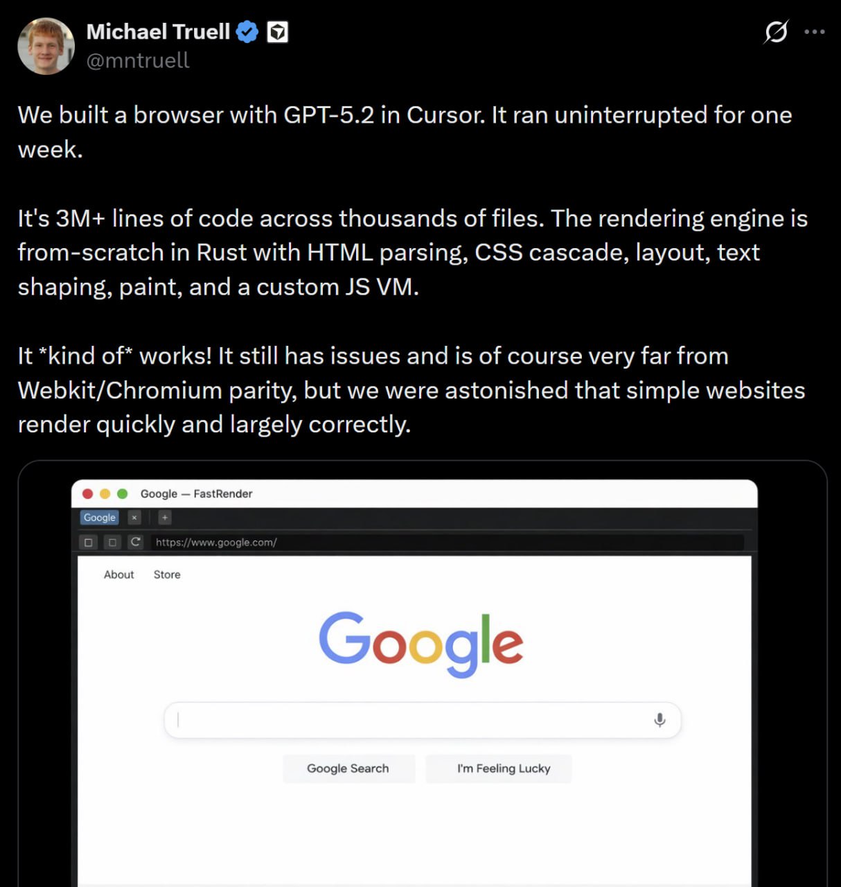 Гендир Cursor рассказал, что скоординировал команду ИИ-агентов GPT-5.2 и попросил их с нуля создать ПО для интернет-сёрфинга.