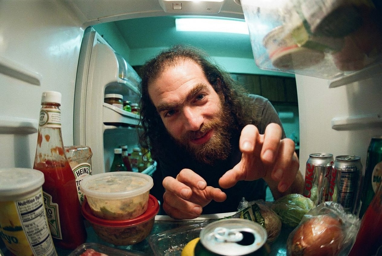 Use the uploaded photo as the character. A POV shot from inside an open refrigerator, extreme wide-angle/fisheye, with the subject leaning in and reaching toward the camera, fingers slightly distorted. Bright, cool fridge lighting, messy everyday food items in the foreground, and raw early-2000s snapshot energy with slight noise and unpolished realism