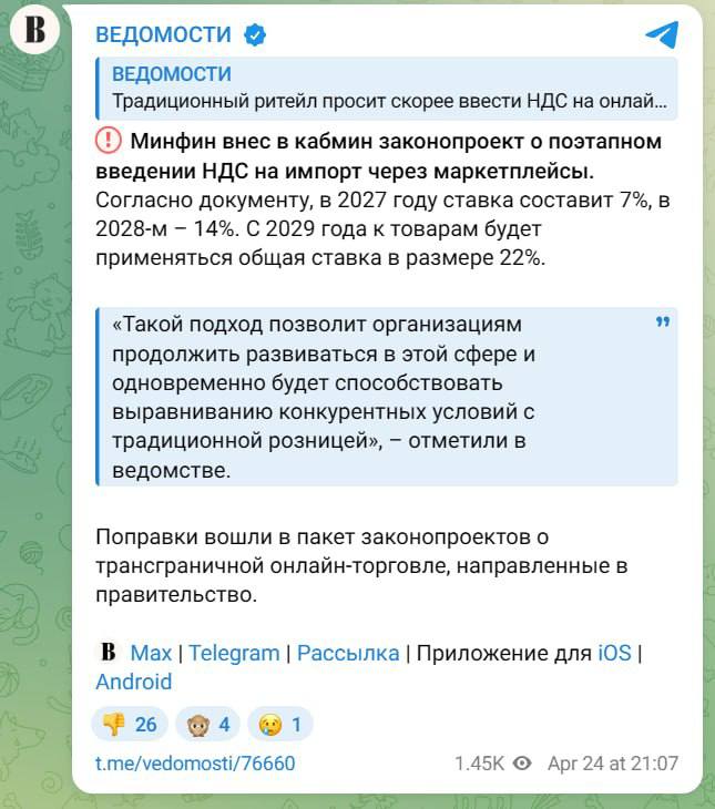 ⚡️ Иностранные товары на маркетплейсах ПОДОРОЖАЮТ — Минфин внёс в кабмин пакет законопроектов о трансграничной онлайн-торговле.