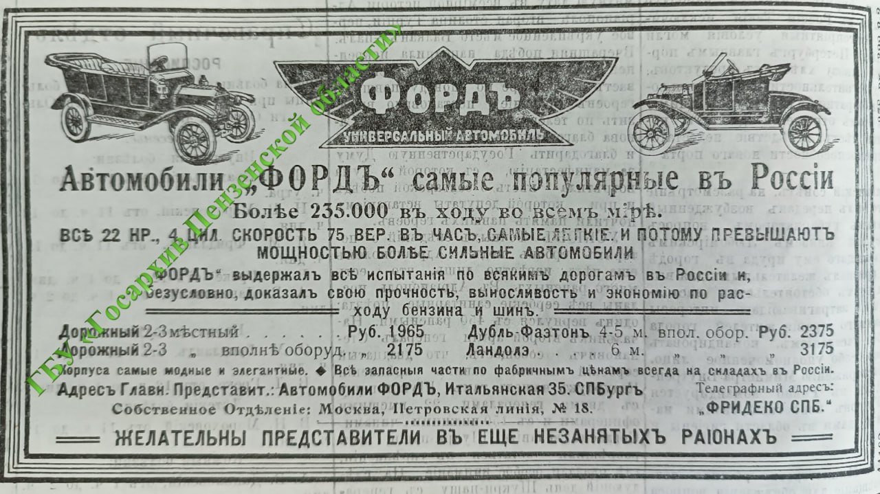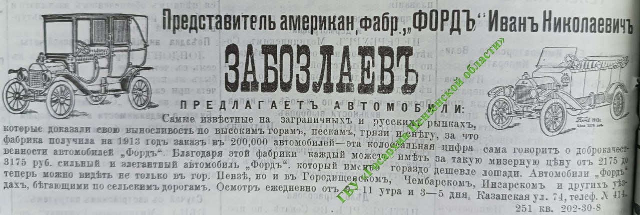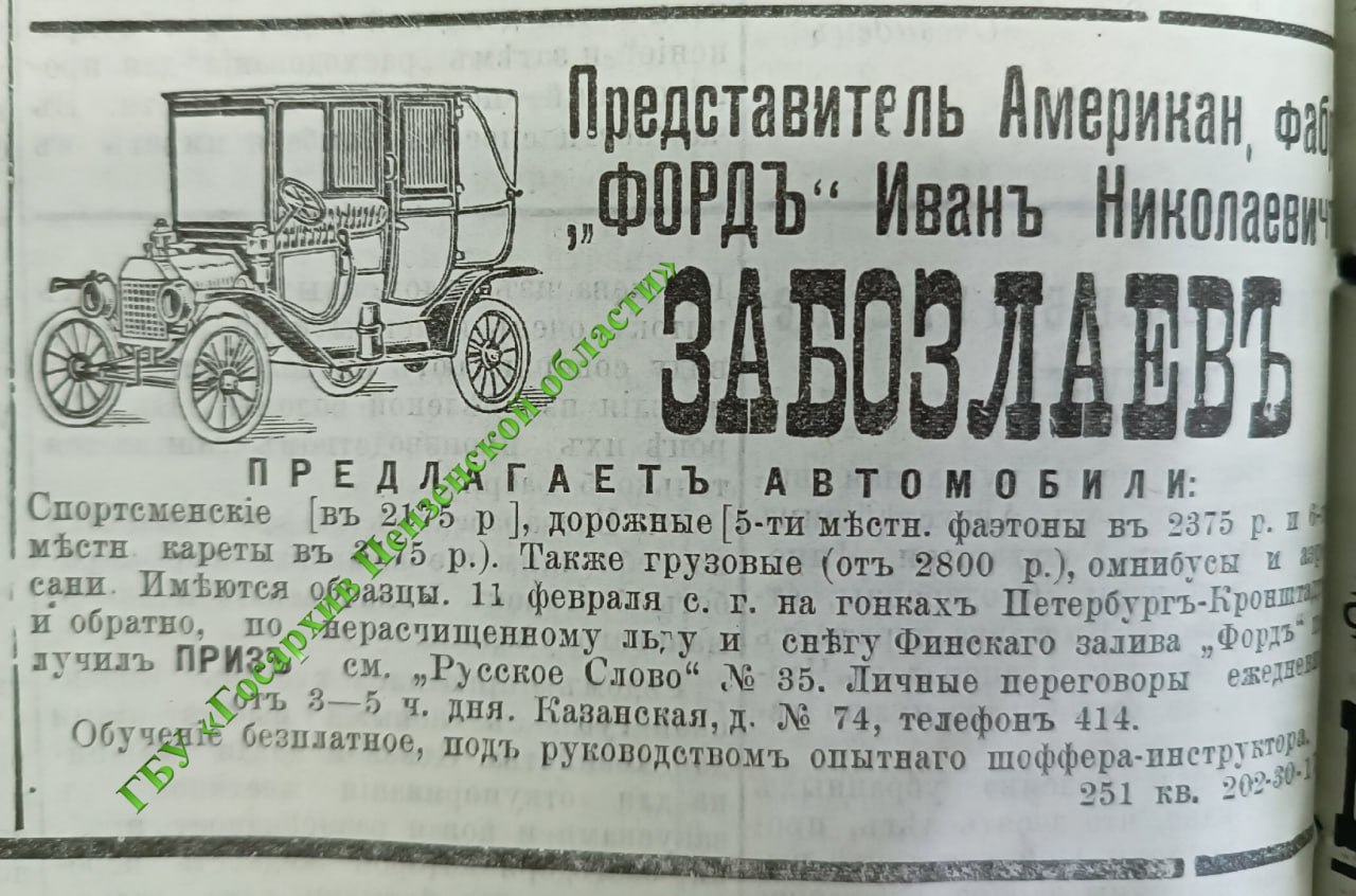 🚘 Первый продавал автомобили марки «Форд». Заведовал им мещанин Иван Забозлаев. Договориться о покупке можно было на улице Казанской,74 (ныне Урицкого). Коммерсант предлагал: