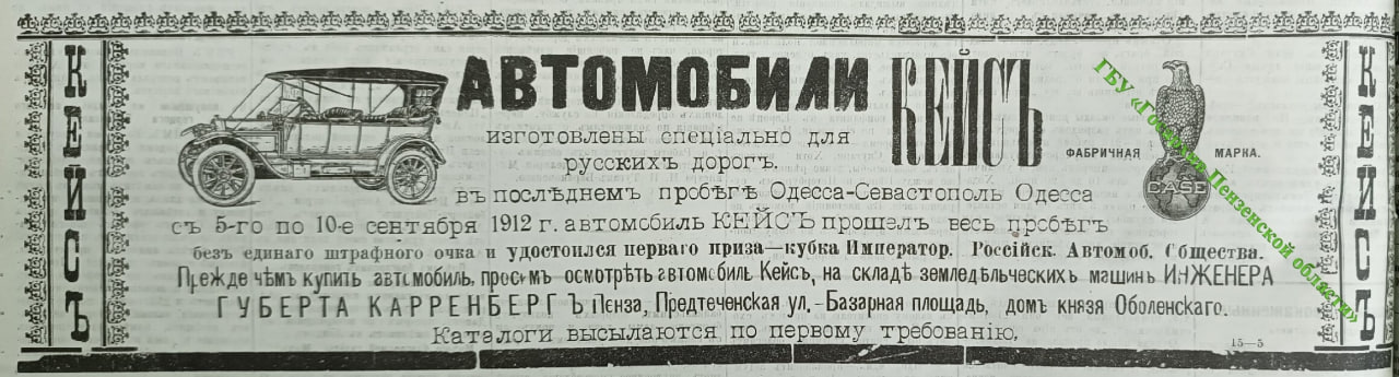 🚓 Именно на автомобиле марки «Кейс», будучи в командировке в Пензе, разъезжал великий князь, генерал-инспектор артиллерии Сергей Михайлович Романов. В Пензу он прибыл для осмотра войск.