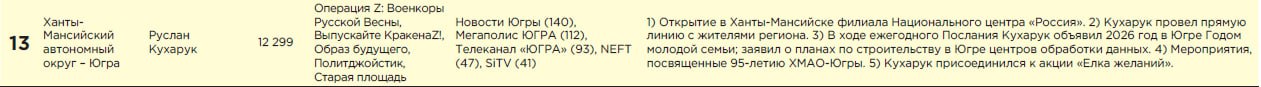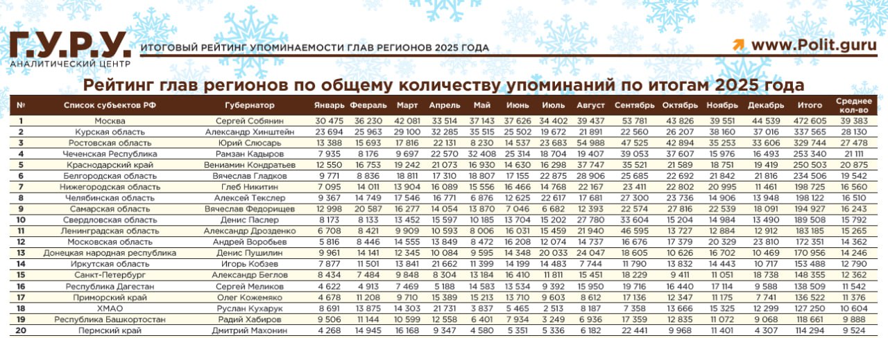 13 января были опубликованы результаты новогоднего исследования «Индекс Telegram. Рейтинг эффективности российских публичных политиков через призму Telegram. Итоги 2025 года». «Индекс Telegram» - первый в России политический рейтинг, составляемый при помощи нейросетей.