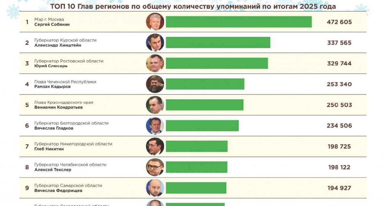 Тройка лидеров среди губернаторов регионов Дальневосточного федерального округа (ДФО) по общему количеству упоминаний в Telegram по итогам 2025 года выглядит так: