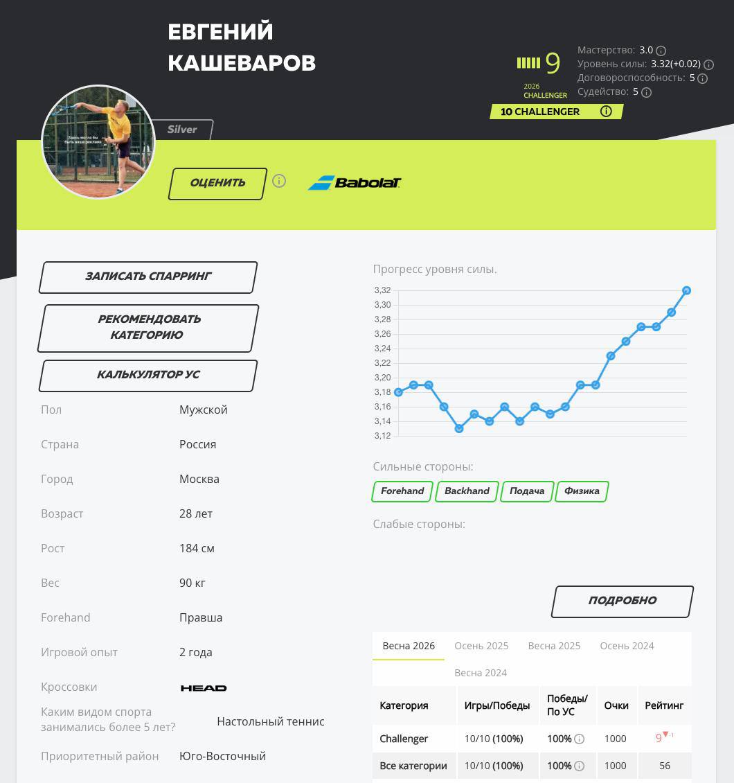 Сейчас играет в лиге Tennison — категория Tour.