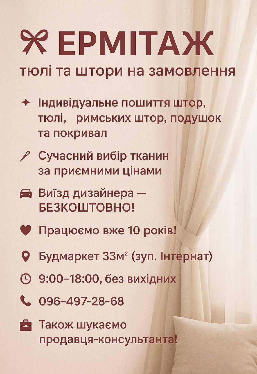 🏠 Магазин тюлей та штор ЕРМІТАЖ пропонує пошиття штор (римські штори), тюлі, подушок та покривал. Сучасний вибір матеріалу за хорошими цінами! Виїзд дизайнера - БЕЗКОШТОВНИЙ! Працюємо вже 10 років! Чекаємо на Вас! ❤️