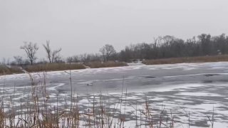 Через пошкоджене крило, птах залишився самотнім, без можливості літати, серед замерзаючого ставка.