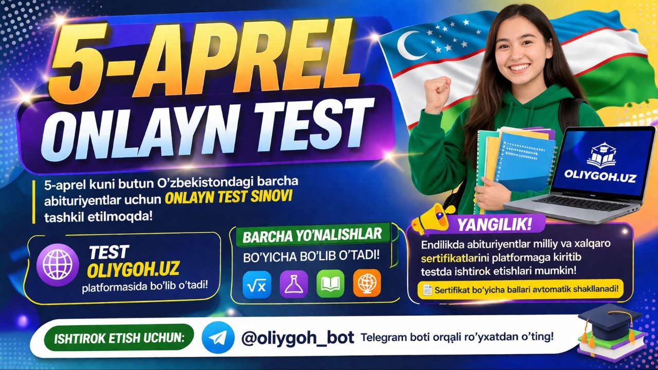 📆 Yakshanba, 5-aprel kuni maktab bitiruvchilari va abituriyentlar uchun Oliygoh.uz platformasida onlayn test tashkil etiladi.
