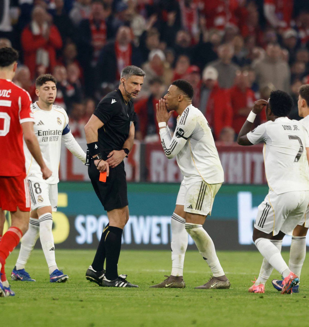 🟥 И именно в этот миг игроки «Баварии» реагируют. Они подают судье сигнал о второй желтой карточке. Винчич затем смотрит в свой блокнот или в свою запись, проверяет информацию… и возвращается к исходной точке. Именно в этот момент он показывает красную карточку.