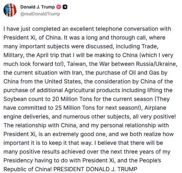 Трамп сообщил, что провел "долгий и обстоятельный" телефонный разговор с Си Цзиньпином.