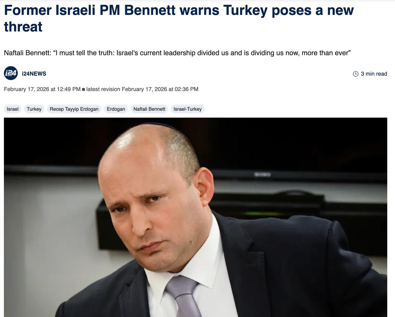 Бывший премьер Израиля Нафтали Беннет призвал к мерам против Турции, которую назвал стратегической угрозой, передает i24news.