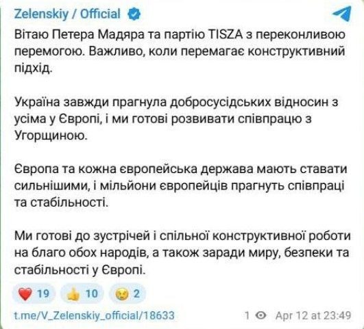 «Я поздравляю Петера Мадьяра и партию Тиса с их убедительной победой.