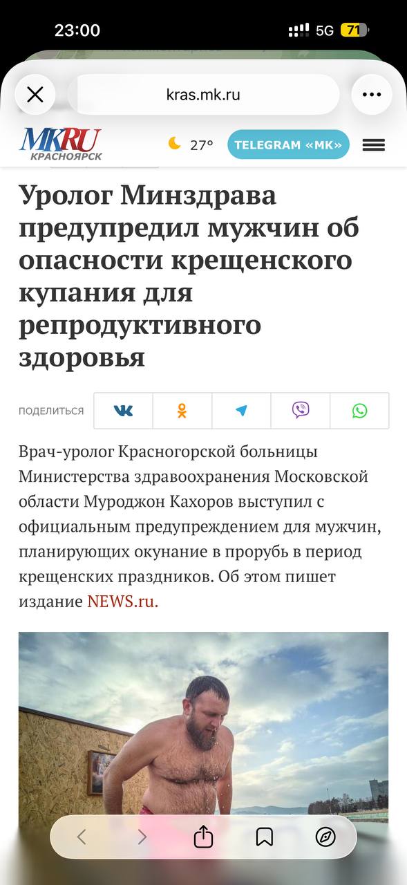 Наши дурналисты в очередной раз показали, что не зря окончили свои заборостроительные техникумы: сразу целая толпа известных и не очень СМИ выдала "экспертное мнение" доктора из подмосковной Красногорской больницы, который предупредил об опасности крещенских купаний. И все бы ничего, ведь каждый год врачи напоминают, что кому попало в прорубь нельзя, но в данном случае против древней крещенской традиции добрых русских людей выступил уролог по имени Муроджон Кахоров.