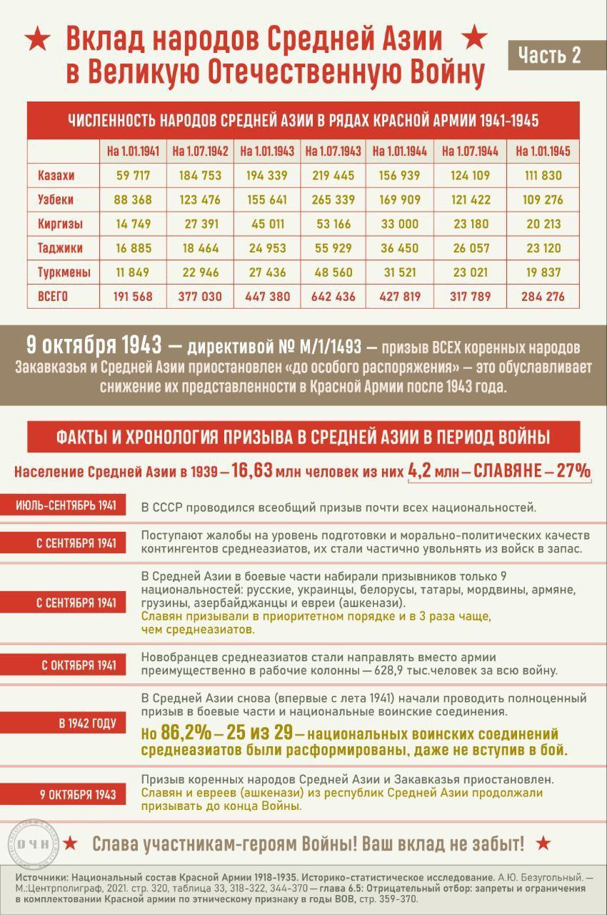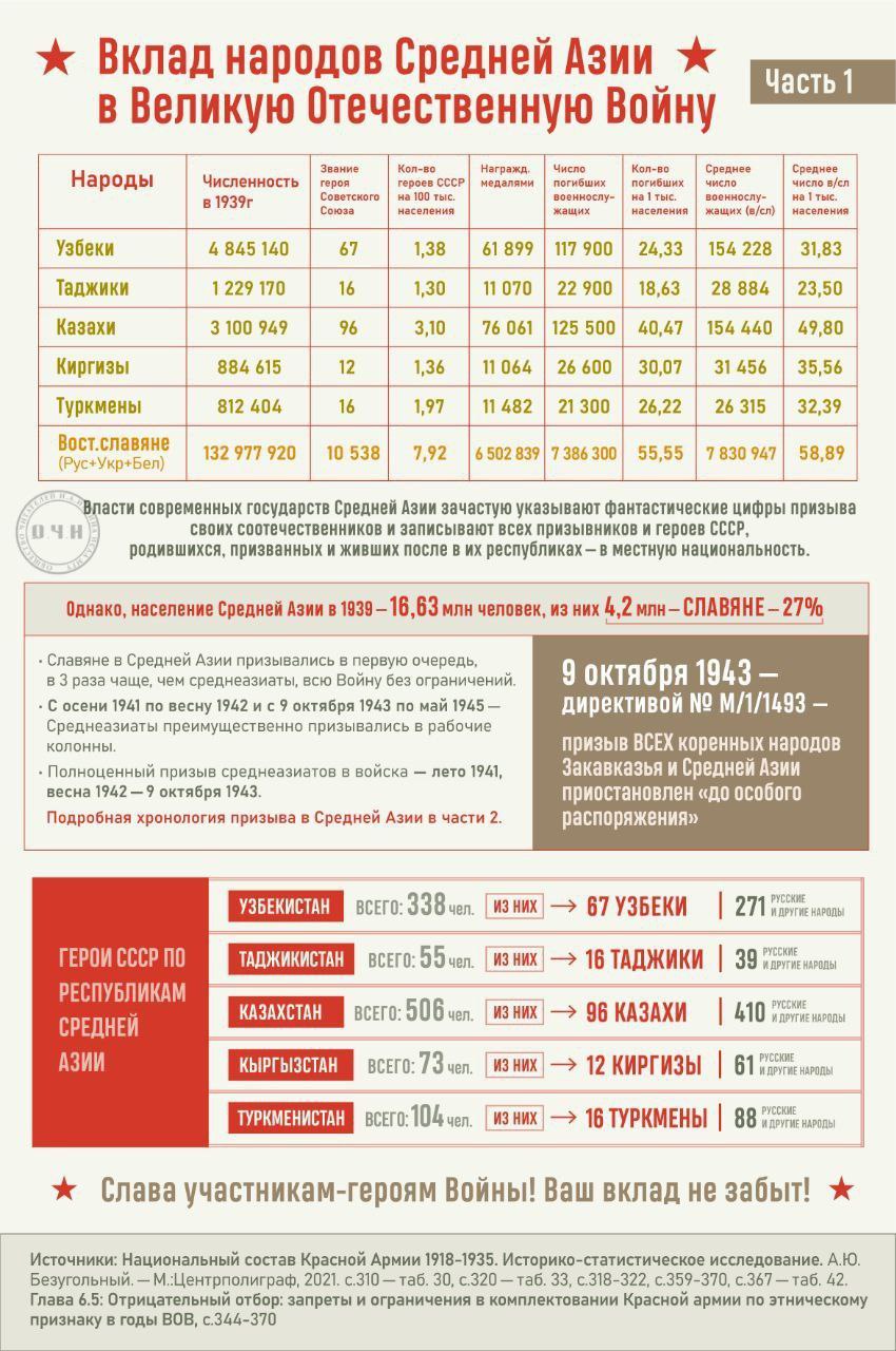 Мы уважаем вклад в победу всех народов СССР, но нельзя позволять властям республик Средней Азии манипулировать данными, [ а нам вестись на эти манипуляции] и на основе этих мифических цифр требовать преференции для своих соотечественников в России сегодня.