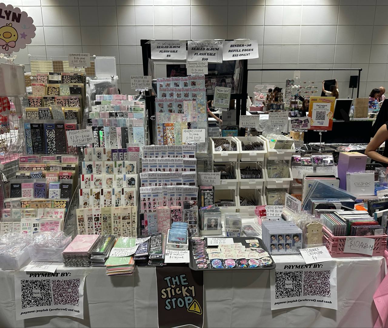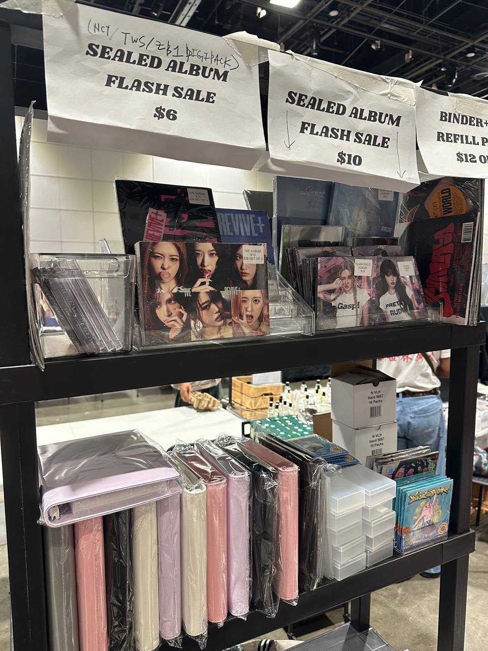 Flash sale albums and some other items will likely be behind me and my friend so if yall want anything from the shelf just let us know!😋 ( I thought the shelf was going to be beside our table not behindbut we learn and live)